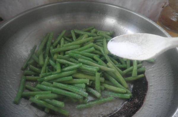 接下來燒一鍋清水,往裡面加入幾滴食用油,再加入一小勺食鹽,水開以後把豇豆放到鍋裡面焯一下水,這個豇豆焯水的時候加一點油和食鹽,可以有效防止豇豆在焯水的時候變色,開大火把豇豆焯水三分鐘左右。