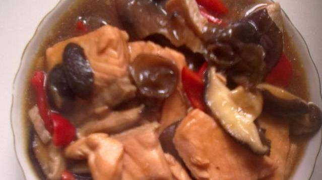 滑三文魚塊:三文魚肉切塊加少許白砂糖、淀粉、生抽拌勻;鮮紅椒切塊加少許鹽醃漬備用;鮮香菇、木耳、生薑切片,香蔥切粒,調濕淀粉備用;將香菇片放入炒鍋,撒上鹽花,小火煎香,起鍋備用;鍋中倒入色拉油薑片,煎香後加入鮮紅椒、木耳和香菇翻炒,加作料及100克左右的食用水;開鍋後倒入三文魚肉加入料酒,快速在鍋中滑炒至半熟時用濕淀粉勾芡,加香醋炒勻起鍋,撒上香蔥即可。