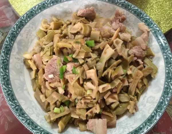 肉絲炒筍幹:將水發筍幹切成末備用;鍋內倒入適量食用油,加熱至油溫六成熱,放入肉絲翻炒,將肉炒至變色倒入筍幹繼續翻炒;加入一點黃酒、鹽、少量的水煮開,再加入蔥花拌勻即可,非常好吃。