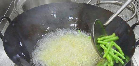 5. 在這我們就可以先把四季豆放在油鍋裡面去炸上一遍,這個時候要註意的就是油要在5成熱左右,炸至一分鐘左右,四季豆的表皮都已經起皺瞭,而且它的顏色變得非常的綠,這個時候就可以撈出控油瞭。