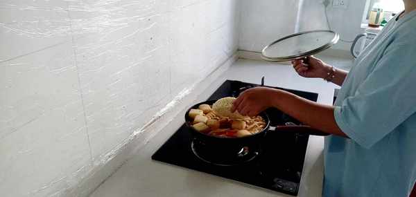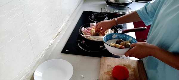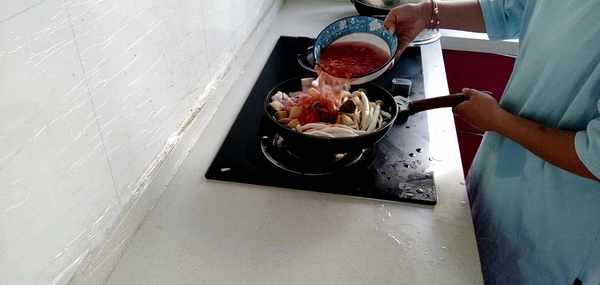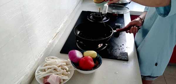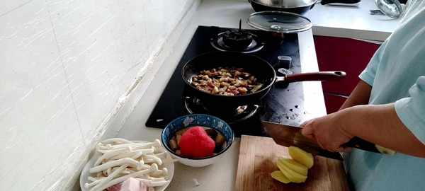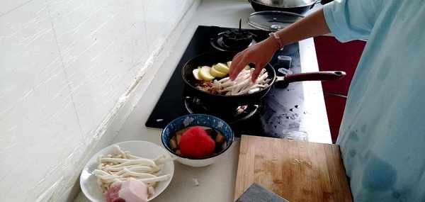 2.開火,鍋裡放油,先把洋蔥切碎放在鍋裡翻炒變色出香味,然後把切成厚片的土豆放進去,再依次放入白玉菇、切薄片的肉和火鍋丸子,最後再把西紅柿切碎裝碗加入少許食鹽和適量的清水調制的醬汁倒入鍋裡,蓋上鍋蓋大火燉煮。