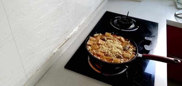 3.等鍋裡面的食材都煮入味之後,再加入一塊泡面蓋蓋煮30秒左右,好吃的部隊火鍋就完成啦!