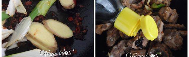 6.放入羊蠍子炒,調入料酒、醬油翻炒。