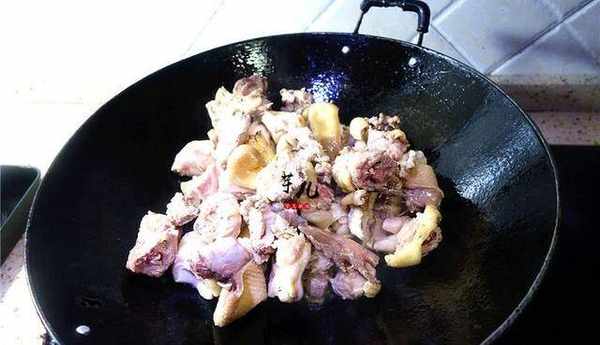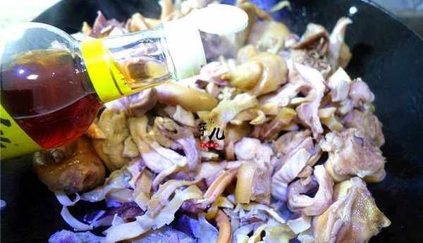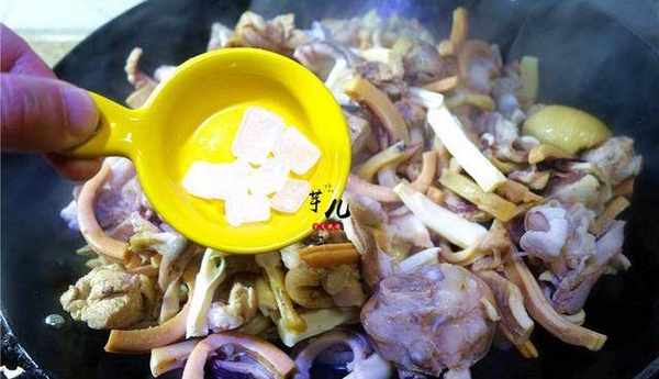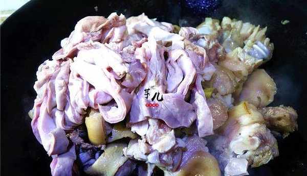 7.將蹄花放入鍋裡爆炒2分鐘,再放入雞塊爆炒。