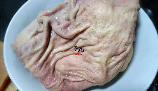 2.新鮮豬肚用剪刀剪開,放入適量面粉,白醋清洗幹凈,放開水裡汆水2分鐘,取出放涼。再切成肚絲。