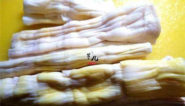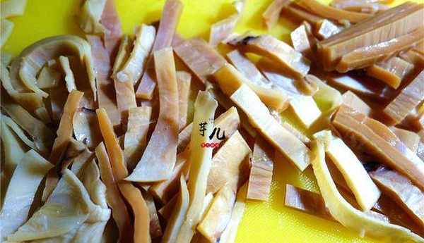 3.幹冬筍提前一天用冷水泡發。洗凈切成長條狀。
