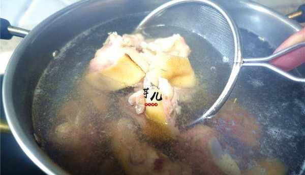 1.分別將洗凈宰好的雞肉,豬蹄,魷魚放入開水裡汆水,取出放涼。