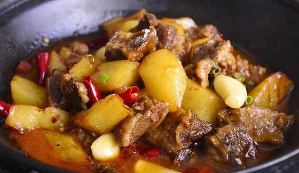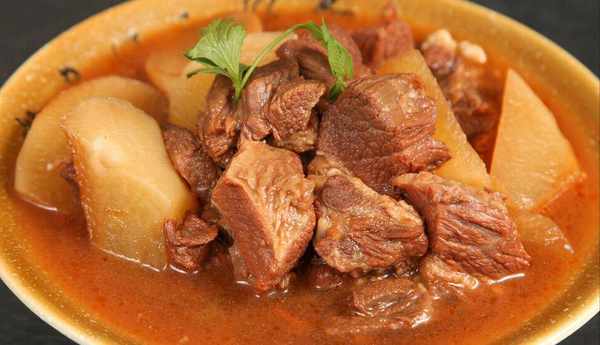 5、大火燒開瞭之後,小火燉上40分鐘左右,接著將切好的蘿卜和土豆倒進去,再接著燉20分鐘左右。最後燉到湯汁減少後,我們加鹽來調味,翻炒均勻後,用大火把多餘的湯汁收一下,即可裝盤出鍋。
