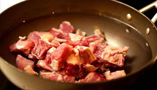 3、這樣焯燙過後,血沫也少瞭很多,焯燙之後撈出來沖洗一下,就可以瞭。之後再把胡蘿卜、土豆處理一下,去皮以後切滾刀塊備用。鍋內倒油,油熱倒入牛肉塊,開始翻炒,炒到表面微微變色。