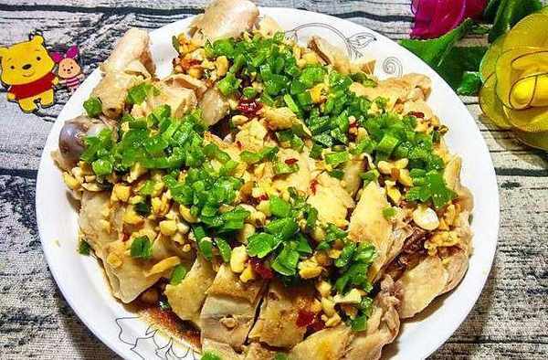 【傢常版口水雞腿】用料:琵琶雞腿兩個,青椒丁,蔥花,蒜末,花生碎,蒜末,兩勺生抽,一湯勺香醋,白糖,一勺蒜蓉辣醬(這個辣醬是微辣的,喜歡吃辣的辣醬辣油隨便加),薑片,八角,香葉,蔥結。