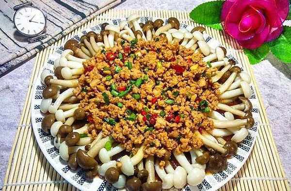 【肉糜蒸菌菇】用料:蟹味菇,白玉菇,肉末,生抽,老抽,白糖,蒜蓉辣醬,鹽,料酒,淀粉,蔥,薑,蒜。