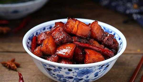 【紅燒肉】用料:帶皮五花肉500克,生薑2片,大蔥1段,香葉1片,八角1個,紅幹椒3-4個,生抽2湯匙,老抽17大匙,料酒2湯匙,冰糖12克,鹽適量。