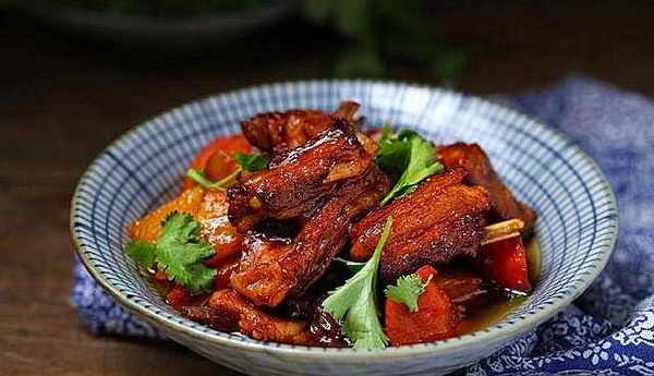 【紅燒羊排燉土豆】用料:羊排800克,土豆1個,胡蘿卜1個,大蔥1段,薑4-5片,八角2個,香葉1片,桂皮1小段,生抽2湯匙,料酒2湯匙,老抽1大匙,冰糖12克,白醋少許,鹽適量,清水適量,香菜1根,食用油適量。