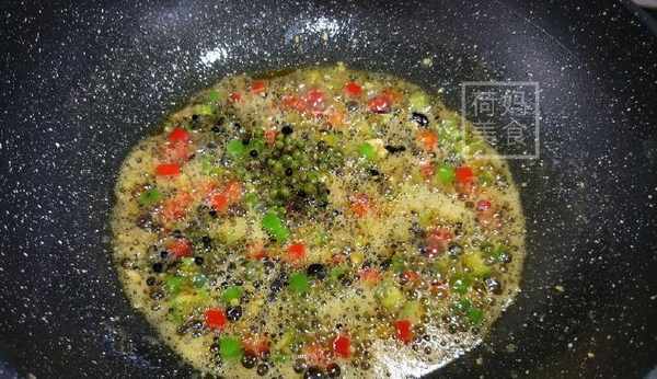5、蒸鍋的時間,另起炒鍋燒熱,倒入50 g油燒熟,放入薑蒜末炒香,放入鮮藤椒,豆鼓和青紅椒稍微炒一炒,加入鹽,白糖,鼓油調味關火。註:青紅辣椒略微炒,稍微斷生即可,不然顏色不好看哦。