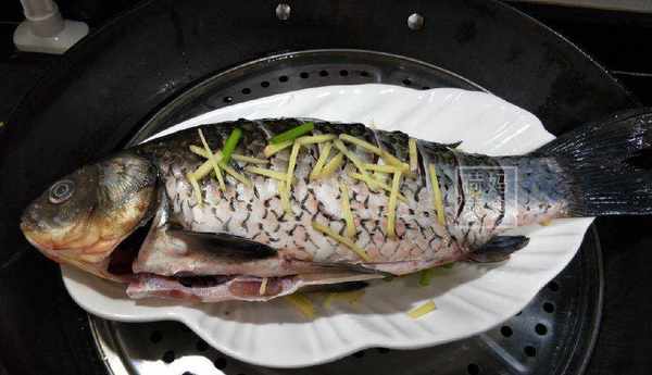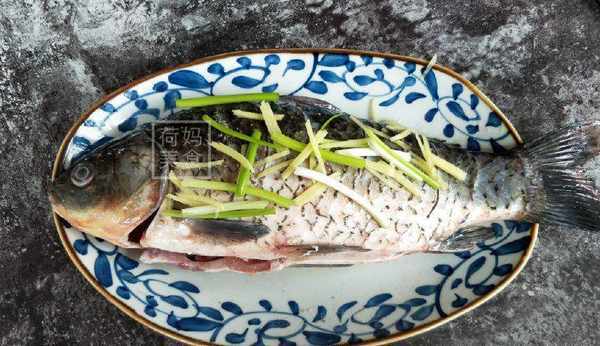 3、醃好的魚清洗一下,另備一個魚盤,放上薑絲,蔥段墊底,放上魚,再放薑絲,魚肚中塞一個蔥結