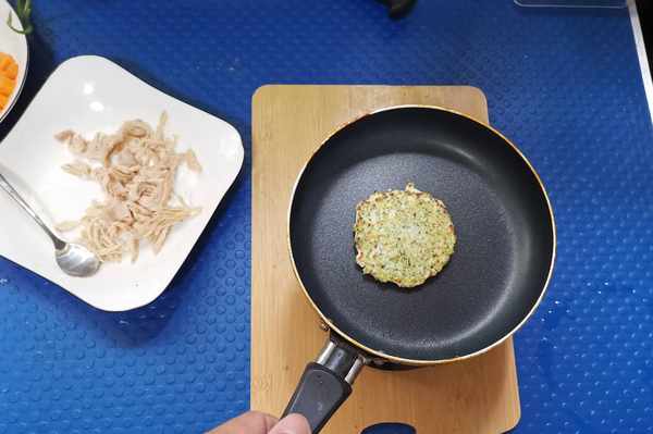 微黃,成型即可,註意不要反復翻動,否則容易散開。期間將雞肉用白水煮熟(蒸制口味更佳)。