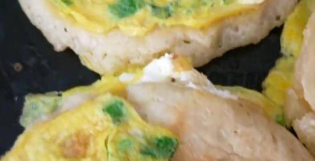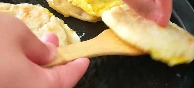 還沒有凝固的時候,把做好的餅蓋在上面,讓餅和蛋液很好的粘合在一起,隻撈到雞蛋定型成金黃色就可以瞭。把餅盛出來,再一次放入蛋液。把餅的另一面放到蛋液上,這樣可以保證餅的兩面都裹滿,雞蛋特別的香。把餅的兩面都烙著金黃就可以出鍋瞭,可是香味已經飄出來瞭,真想馬上吃一個,而且看著就特別有食欲,當早餐是非常不錯的選擇。