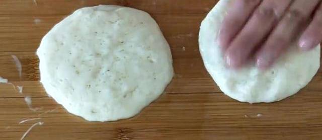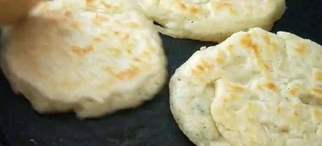 面團像這樣就是發酵好瞭,面板和手上都要抹油防粘,把面團直接拿到面板上,不要揉面,用手整理成長條狀,平均分成8個面積,像這樣手上抹油,來回地把面積團圓,放到面板上整理成圓餅就可以瞭。丁敏稱提前預熱刷油放入做好的餅胚。並在餅的表面滴些糧油。抱著一面變色微黃給餅翻個面。反復地給餅翻面,一直烙到兩面金黃即可,用鏟子按壓小餅會快速回彈,就可以把餅盛出來瞭。中留少許的油放入提前準備好的雞蛋液快速攤平整。