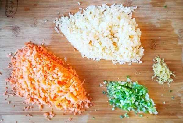 首先炸丸子:1,紅蘿卜,土豆切成碎末,蔥薑切成碎末。
