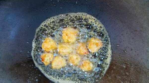 小貼士:和丸子面時,加水註意不要加的太多,以免和得太過於稀瞭;炸的時候要用小火,這樣可以不讓丸子糊掉,而且中間也可以炸透。