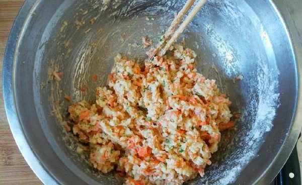 2、給紅蘿卜,土豆末裡邊加入50克面粉,一個雞蛋,一勺五香粉,兩勺鹽,半勺雞精。再加入50克水,攪拌均勻。