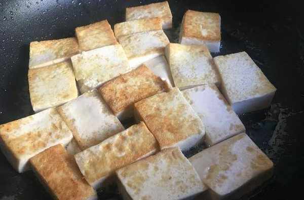 5、平鋪放入豆腐片,中火煎至兩面金黃;盡量少翻面,可頻繁晃動煎鍋來使其受熱均勻;