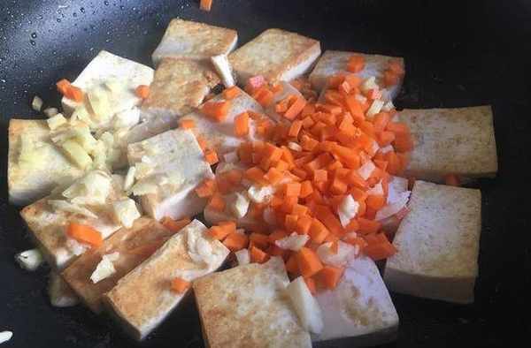 胡姬花古法花生油15克、豆腐1塊、生薑10克、大蒜4瓣、胡蘿卜半個、生抽2勺、老抽半勺、糖1勺、蠔油1勺、小青菜4顆