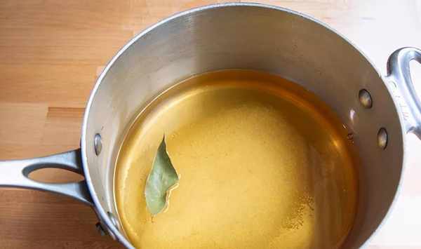 用中火將3杯蘋果西打、鹽和月桂葉加入鍋中。攪拌直到鹽溶解,然後關火。