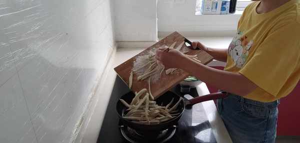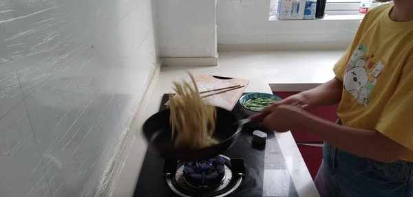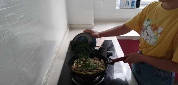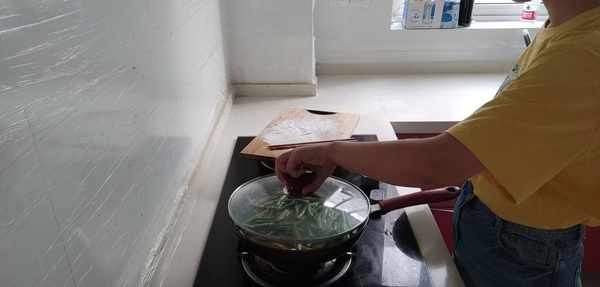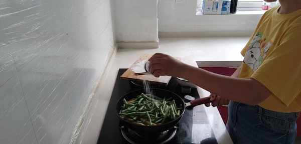 3.開火,鍋裡放油,把裹有面粉的茄子條放進平底鍋裡,反復地顛鍋翻面,直到茄子條呈現金黃色,把一指長的豆角段倒進去,加點鹽進去調味,最後再加一碗水進去,蓋上鍋蓋中火燉煮。