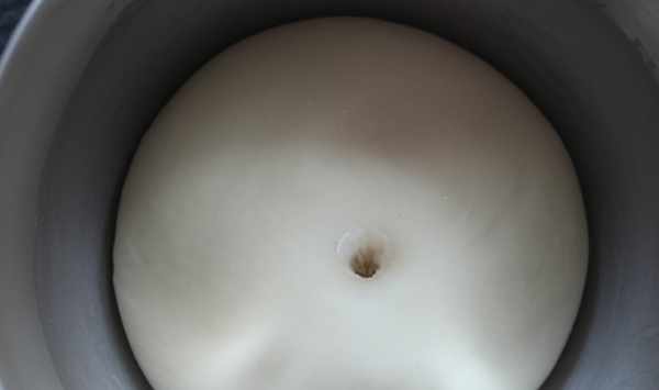 5把面團裝入容器,蓋上保鮮膜,放在溫暖的環境裡(28度左右)裡發酵至2倍大,手指蘸幹粉,在面團的表面戳一個洞,洞口沒有立刻回彈,面團也沒有塌陷,說明基礎發酵完成。