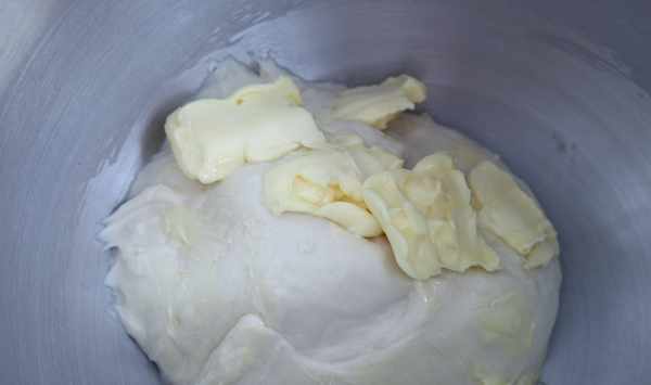 4先用低速攪打到黃油完全被面團吸收,然後轉中高速攪打,直到面團能抻出細膩結實的薄膜,破口處的邊緣光滑無鋸齒。