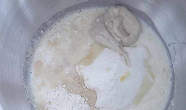 1高筋粉、牛奶、蛋液、細砂糖、酵母粉、法式老面放入和面缸裡。