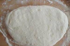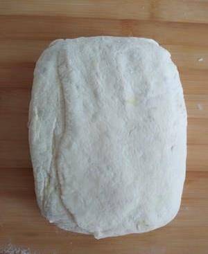發好的面團倒在案板上用手按平就好,千萬不要用手揉