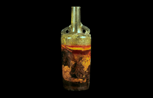 這瓶還有時尚的酒瓶埋葬於一個公元4世紀的羅馬貴族墓穴中,裡面有兩個石棺,一個裝著男性身體的石棺,另一個裝著女性身體的石棺。據稱,墓穴的主人是羅馬軍團的成員,這瓶酒是為他的天堂之旅準備的。