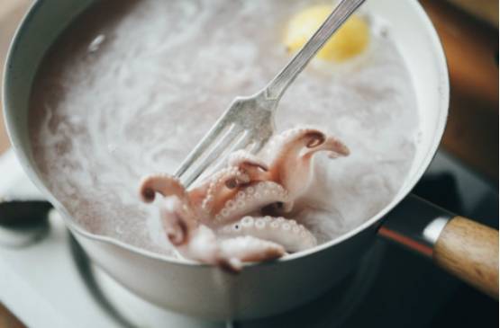 有些人會用冷水煮,或者是開水煮,這樣煮出來的八爪魚就會咬不動,這種水熱之後下八爪魚是最好的。