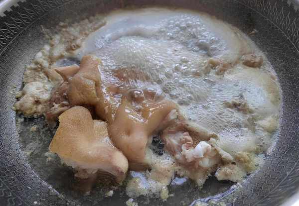 第二步:豬蹄的外皮已經燒過瞭,拿回來刮幹凈,簡單清洗一遍,再放入冷水鍋中,加入一部分薑片和料酒,焯水10分鐘。把上面的浮沫撈掉,再把豬蹄撈起沖洗幹凈,瀝幹水分。