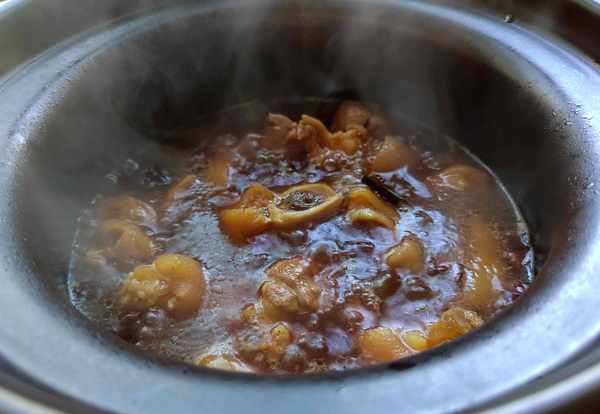 配料:花生油40克;碎冰糖30克;八角3個;桂皮兩塊;生薑1塊;生抽20克;紅燒醬油3克;蠔油10克;料酒30克。