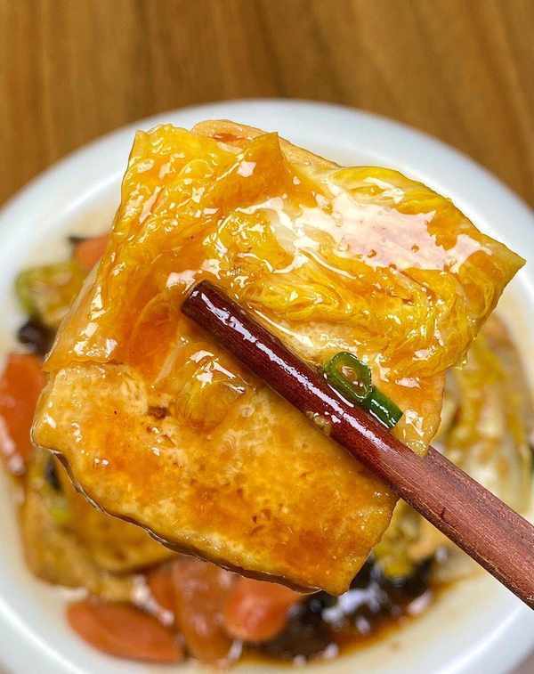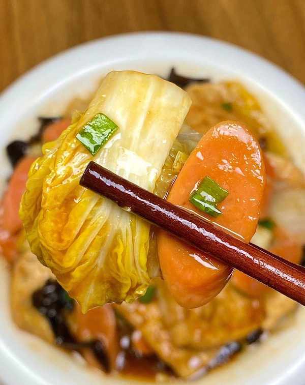 在剩下的油中加入蒜末爆香後倒入白菜、木耳和火腿,翻炒均勻後加入一勺生抽、半勺老抽和一勺蠔油,再次翻炒均勻。隨後,將煎好的豆腐加入煮沸的清水中燜煮五分鐘,最後加入少許水淀粉煮至濃稠即可。最後,撒上蔥花即可出鍋。