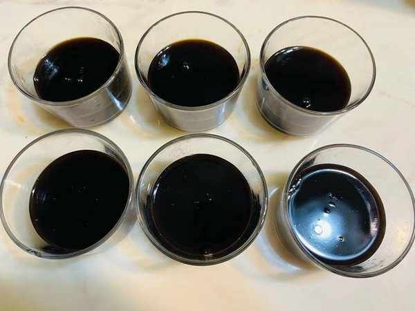 1、準備食材,吉利丁片泡冰水備用,使用關西農會市售的無糖仙草茶,也可以自行熬煮,取一部分的仙草茶,放入太白粉攪拌至無粉粒狀。