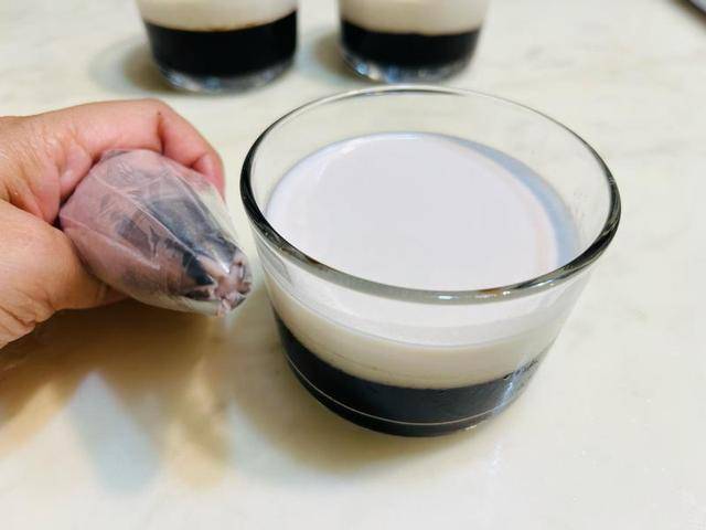 7、將冷卻好的芋泥鮮奶液倒入剛剛冷藏好的仙草凍上方,再放入冰箱冷藏約5小時以上,趁仙草芋泥奶酪凝固的時間,將芋泥過篩,再填裝至擠花袋中備用。