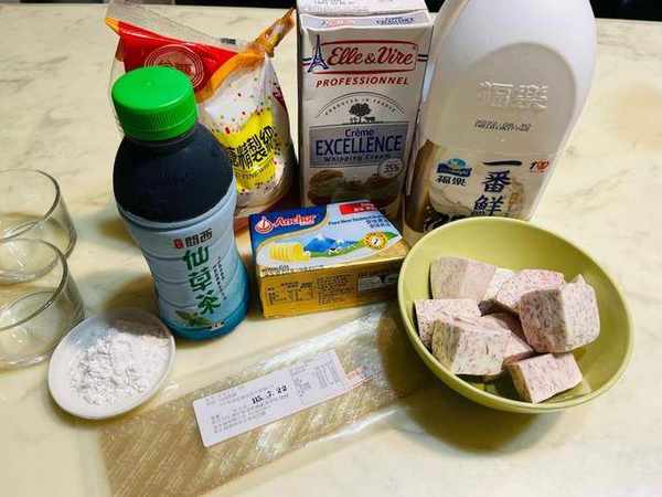 芋泥奶酪:牛奶150克、細砂糖30克、吉利丁片2片、動物鮮奶油150克、芋泥50克