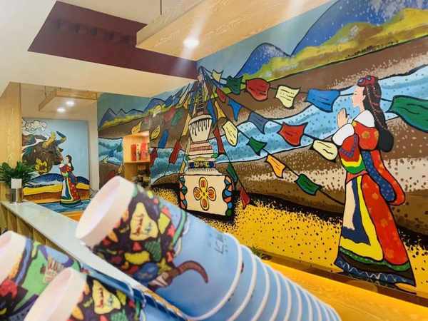 門店更是加深瞭西藏氛圍,面積不大,整墻藏族風格的壁畫映入眼簾。