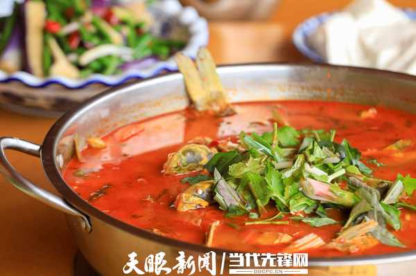 用西紅柿和紅辣椒打碎發酵而成的自釀紅酸湯是鍋底的靈魂。熱鍋入油,調料爆香,取兩勺紅酸湯和本地歐休菜(酸菜),加適量清水微微煮開,再放入魚肉下鍋煮熟,撒上辣蓼草,一鍋噴香的酸湯魚便制作完成瞭。
