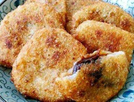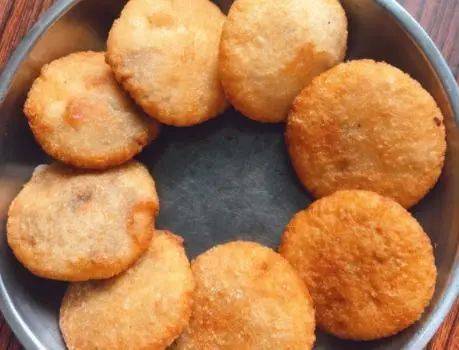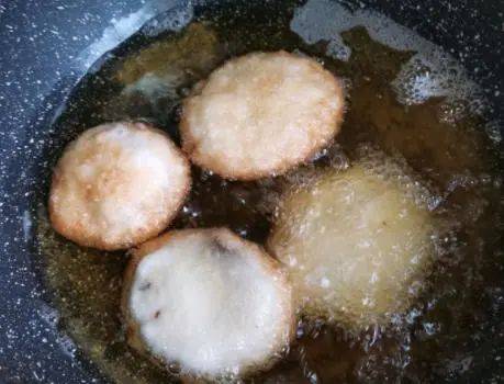 第四步,按照此方法將油炸糕的胚子逐一加工,隨後在鍋中註入適量食用油,待油溫達到六成熱時,逐一將油糕放入鍋中,全程采用中小火慢炸的方式進行;