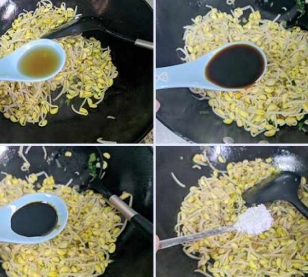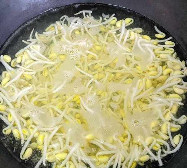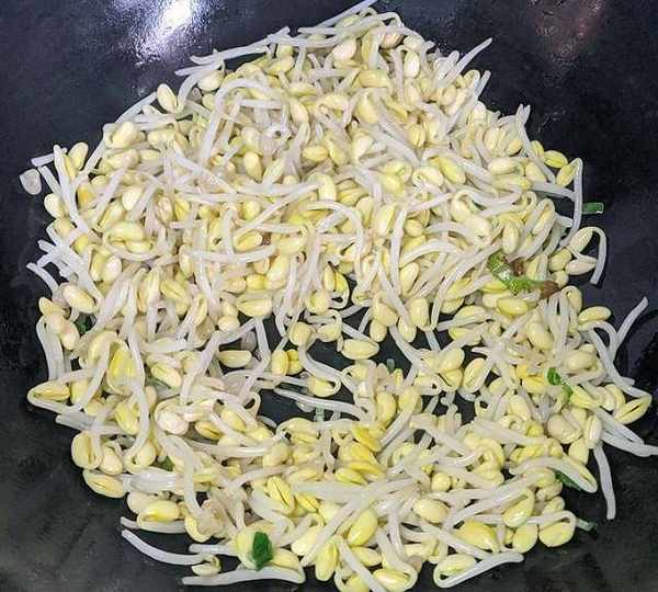 第5步、鍋中底油燒熱,蔥花煸香,放入黃豆芽煸炒。