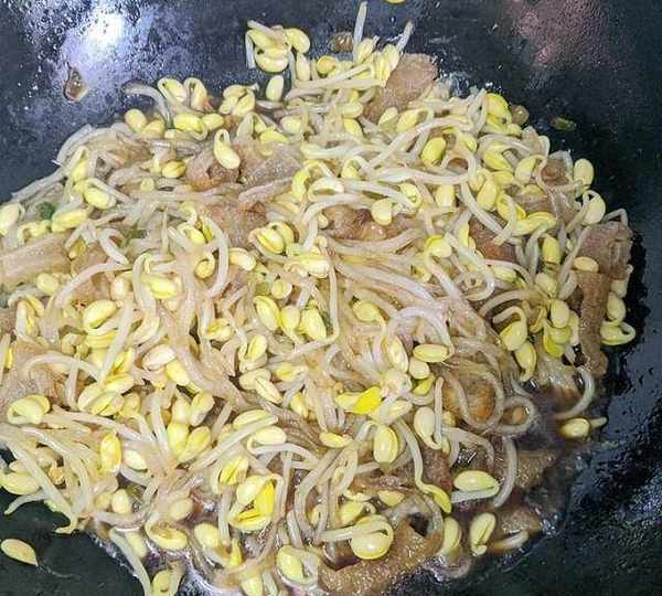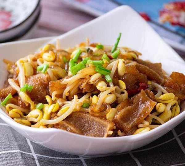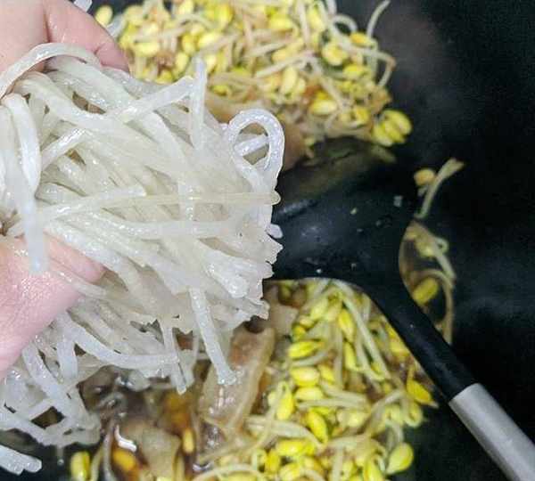 原料:黃豆芽、炸豬皮、粉條、料酒、生抽、老抽、食鹽、白糖。