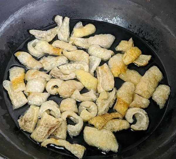 第4步、炸豬皮涼水下鍋,煮制20分鐘後連湯一起盛出來備用。