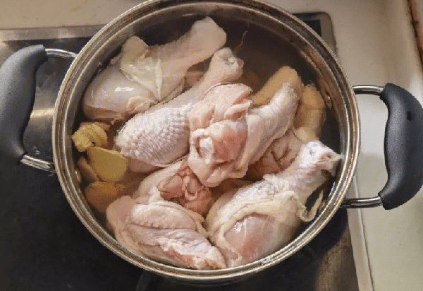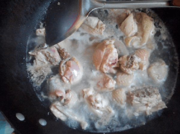 首先,將砍好的雞肉塊放入鍋中,加入適量的清水,水要沒過雞肉,大火煮滾後馬上撈出雞肉洗凈。