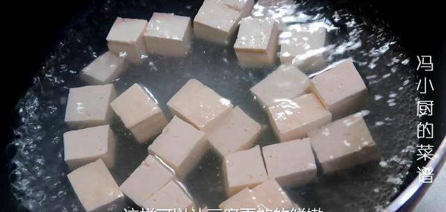 3.鍋中水燒開,下入豆腐焯水2分鐘左右。這樣可以有效的去除豆腥味。焯水完撈出控幹水分。