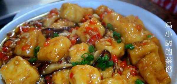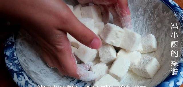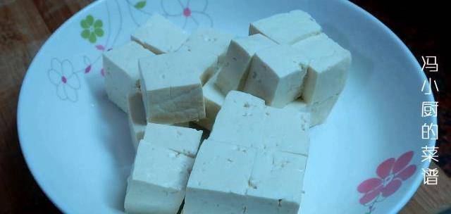 1.老豆腐切成大小均等的小塊,大概2CM厚左右的正方形。